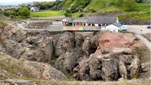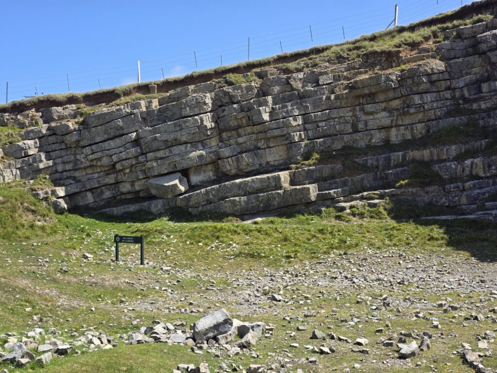 380 million years ago, this area was part of the Euramerica continent. just south of the equator. Where now stands the quarry was a lagoon full of shellfish. Each 'band' on the rock wall represents 150,000 years and it stands on the Menai Strait Fault.